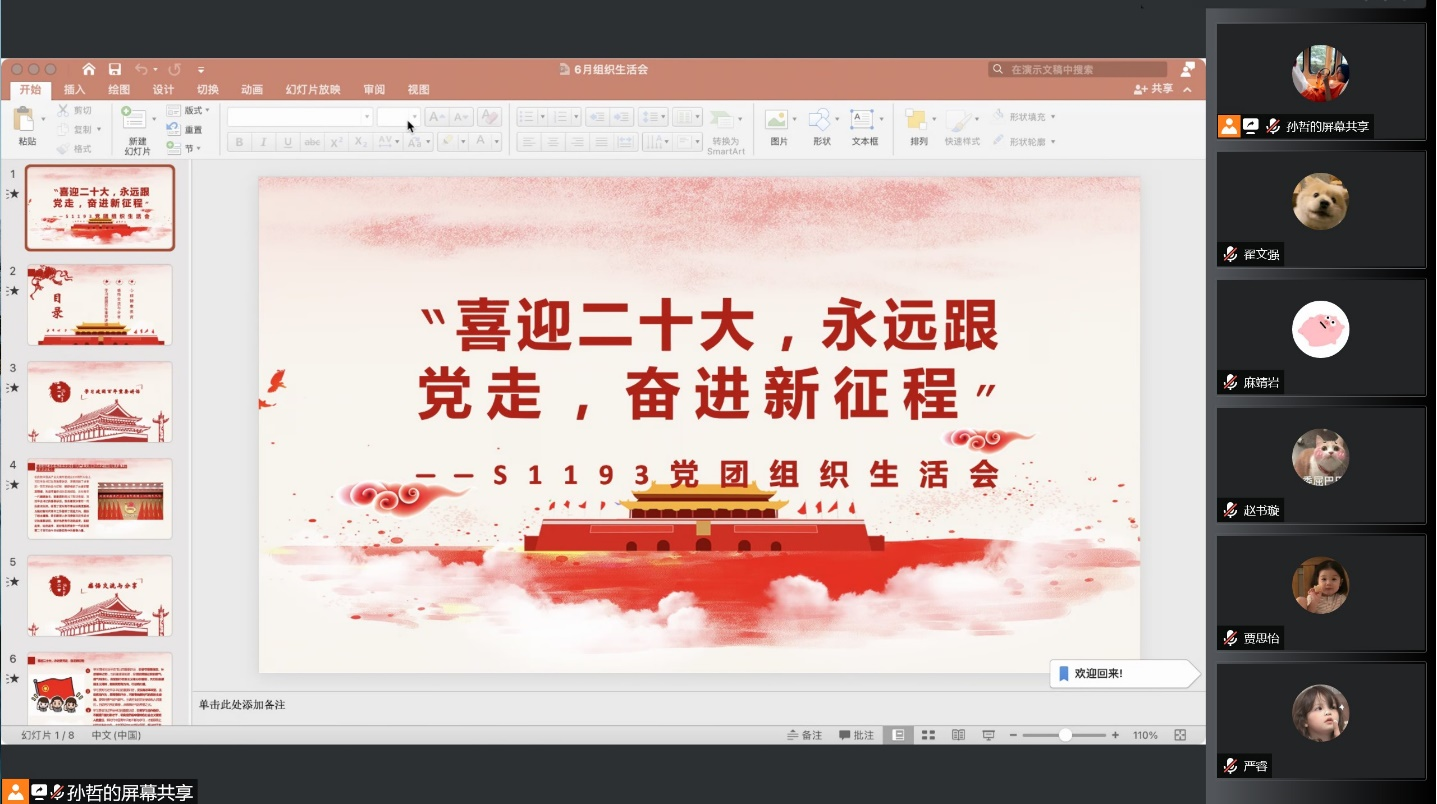 6月10日晚,硕1193党团支部通过腾讯会议线上召开6月组织生活会,会议以“喜迎二十大,永远跟党走,奋进新征程”为主题,重点围绕学习建团百年重要讲话精神、感悟交流与分享、 “积极心理学与幸福感”心理健康教育三个部分展开,党支部书记孙哲主持此次会议。