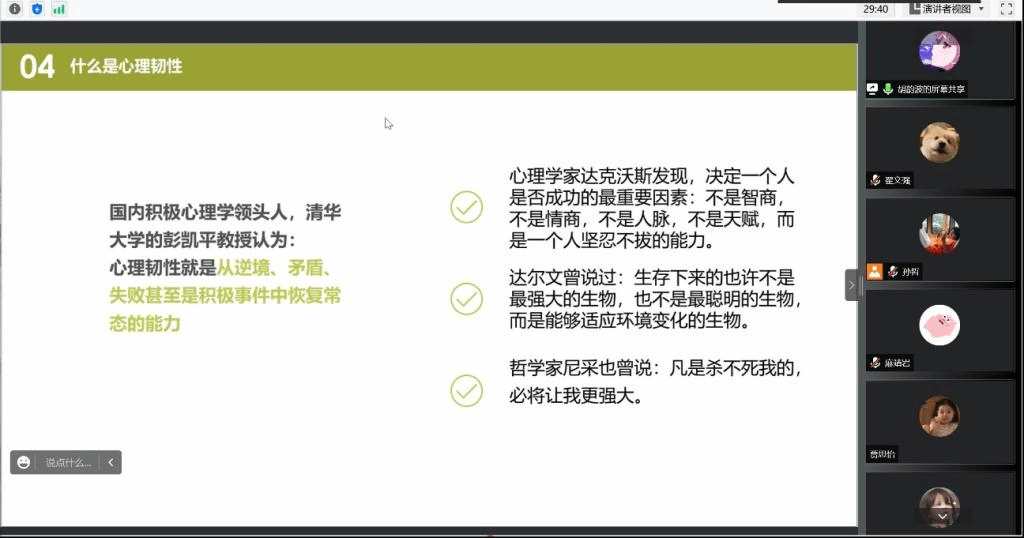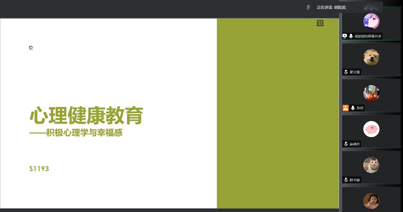 在学习完重要讲话精神后,硕1193班心理委员胡韵波对在线同学进行了心理健康教育。本次心理健康教育主要从积极心理学视角出发,向在线同学分享“心理健康到底是什么”、“幸福感视角下的心理健康”以及“积极心理学之父马丁•塞利格曼的幸福模型框架”等内容。为了使同学们持续保持健康的心理状态,她还分享一个与心理健康密切相关的概念——心理韧性与其提升方式。此外,她还分享了在日常生活中实用性较强的费斯汀格法则,希望同学们能够积极运用并能够真正掌控自己生活中90%的事情。最后,她向同学们推荐了哈佛大学的积极心理学课程,希望同学们能够找出自己的优势和生活的意义,成为更加乐观更加幸福的人。