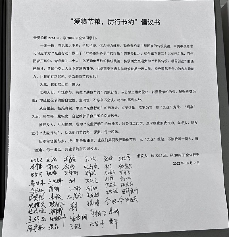 硕2089班团支部书记杜青阳首先向同学们发出“爱粮节粮,厉行节约”的倡议,得到了同学们的热烈反响,纷纷在倡议书上签字。