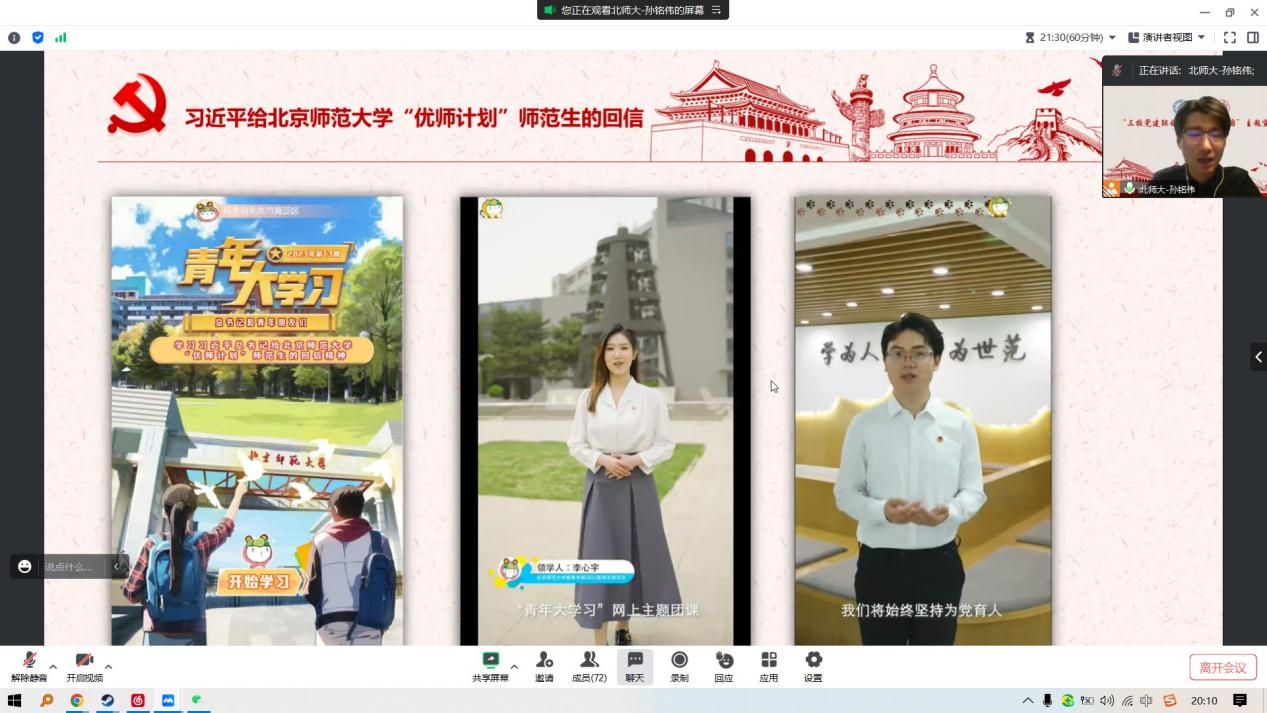 北京师范大学的孙铭伟为同志们分享了《习近平给北京师范大学“优师计划”师范生的回信》的主要内容并交流了心得体会。信中,习近平总书记寄语青年学子继续秉持“学为人师、行为世范”的校训,毕业后到祖国和人民最需要的地方去,努力成为党和人民满意的“四有”好老师,为培养德智体美劳全面发展的社会主义建设者和接班人贡献力量。
