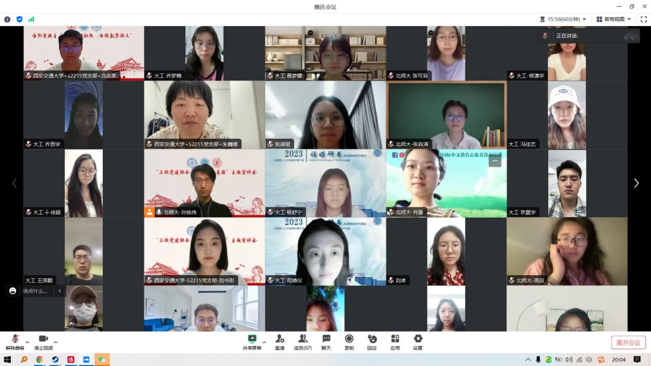 S2215党支部、大连理工大学人文与社会科学学部硕传播学与新闻学学生党支部、北京师范大学国际中文教育学院2022级专硕第二党支部联合开展了“三校党建联合,共话红色基因|学习习近平总书记重要讲话精神”主题党日活动。会议中,来自三所不同高校的80余名党员同志在线上共聚一堂,参与到本次党日活动的交流研讨之中。