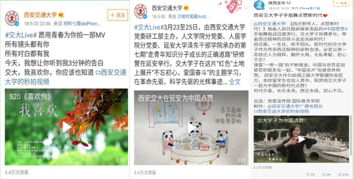 研究生教育”“西安交大通识教育”等。在陕西传媒网、西交新闻网及其他网站上发表新闻消息、评论、理论文章近90篇,学院及学校重要活动宣传工作多有该支部成员的身影;多名支部成员在中央电视台、人民日报社、新华网、湖南电视台、网易新闻、爱奇艺等主流媒体或新兴媒体发光发声,争做时代前端的“瞭望者”,争做新时代“西迁人”。该党支部成员以过硬的政治素养和专业技能,高唱主旋律,传递正能量。如由李鹏飞、王莹莹主导拍摄的《西安交大在延安为中国点赞》手指舞视频以及《我喜欢》学校创意宣传MV获得学校、陕西省各类媒体的转发宣传,累计播放量10万+;支部成员自主策划设计的“香蕉大”主题表情包在微信和QQ表情商店综合下载量和发送量过万。