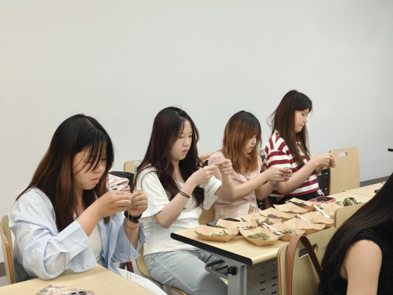端午,五毒之恶月,生人多患病,佩戴香包用以辟邪。活动以香包制作拉开帷幕,在现场,学生负责人已准备好香包、过滤袋与药材,同学们分组围坐在一起,选择自己喜欢的款式,按照功效选取药材并放入香包,一个个造型精美的香包就制作完成了。有同学将香包挂在背包上,有的则打算送给自己的家人、老师和朋友。