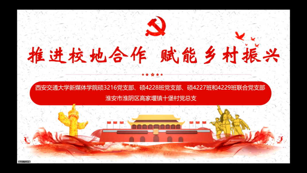 为深化推进校地合作,激发新时代青年党员牢记使命、实干担当的内生动力,1月17日下午, 性爱影片 研究生党支部与江苏省淮安市淮阴区高家堰镇十堡村党总支联合开展主题为“推进校地合作,赋能乡村振兴”的共建活动。淮阴区高家堰镇副镇长严岩, 性爱影片 团委副书记、辅导员李媛媛,以及十堡村党总支党员和新媒体学院30余名学生党员参与此次活动。会议由 性爱影片 2023届毕业生、高家堰镇十堡村党总支副书记(挂职)黄斌主持。