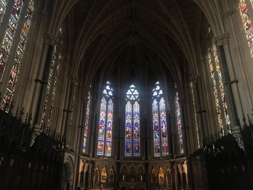 到了市中心后,主要街道商店毗连,人流熙熙攘攘,多了许多商业气息。有名的殉教者纪念碑高高耸立在三条道路交汇处的路口,一座哥特式尖塔,建造于1841年,是为了纪念三位牧师而建,他们因拒绝与新教断绝关系而被烧死在木桩上。他们死后三百年,此纪念碑建成。碑上的人物是那三位殉教者:大主教托马斯.克麦兰拿着《圣经》面向北方,尼古拉斯.雷德利望向东方,而休.拉第摩双臂交叉,向西方俯首。