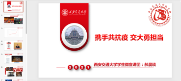 其次,她回顾了抗疫前线中交大人的身影。12月27日,疫情爆发前期,校党委书记卢建军带队检查创新港、兴庆校区教学二区、家属区疫情防控工作,听取各区疫情防控指挥部工作汇报,看望慰问一线工作人员,现场协调解决问题。切实把守护师生生命健康放在首位,坚决扛起疫情防控政治责任。面对来势凶猛的疫情,交大学子第一时间成立志愿服务队,在校志愿服务指导中心发布抗疫志愿者储备招募令15分钟后,可容纳200人的微信群即宣告满员,小小的微信群经历了200人、500人、再到2000人的紧急扩充,仍然无法承载交大学子勇于担当的热忱。志愿者们每日5点50分上岗,负责秩序维持、路线引导、核酸检测引导、为学生送餐等工作,他们以暖心、贴心、温馨的服务,彰显了交大学子的青春风采和力量。最后,她总结到:“人心齐,泰山移”。在西迁精神的感召下,全体交大人共同参与,听党指挥跟党走,与党和国家、与民族和人民同呼吸、共命运”,只要全体交大人同舟共济、全力以赴,就一定能赢得最后的胜利!