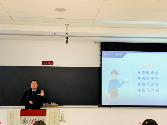 常帅老师从交通安全、消防安全、防范盗窃、防范诈骗四个方面向学生全面讲述创新港学习与生活的安全知识,并结合校园火灾案例说明宿舍消防安全要求,播放校园交通安全事故视频来教育学生要注重校园安全规则、遵守相关规定。近年来电信诈骗猖獗,常老师表示,要警惕各类电信诈骗,保护好生命与财产安全。
