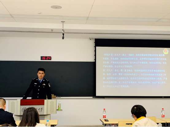 田嘉豪警官从网络谣言的定义着手,重点介绍了网络谣言会造成的负面影响和危害,通过具体案例讲述各类谣言的危害以及后果,并告知学生网络谣言的甄别办法:一看二问三核实。田警官强调:“网络谣言是网络空间的毒瘤,必须坚决清除!打击网络谣言、维护网络安全需要全社会携手共同参与,共建清朗网络空间、共享美好数字生活!”
