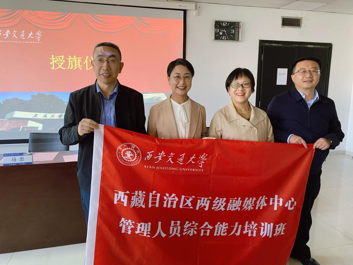 党委常委、统战部部长张定红,新媒体学院院长马忠一同向西藏自治区党委宣传部副部长、政府新闻办主任坦妮娅,党委宣传部媒体融合处处长滕庭国授旗,并预祝此次培训取得圆满成功。